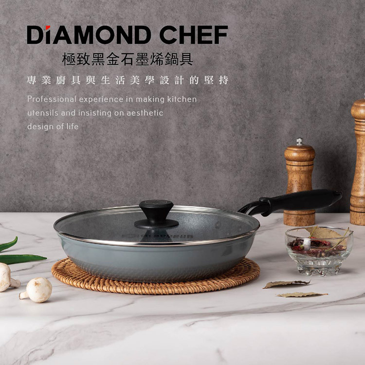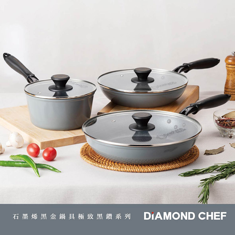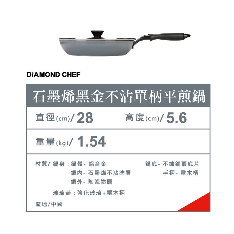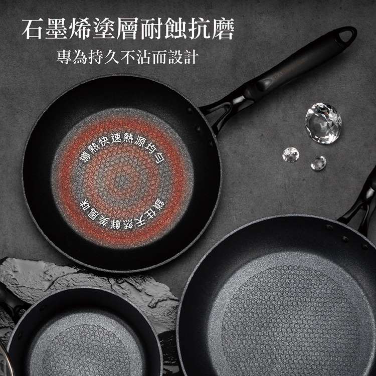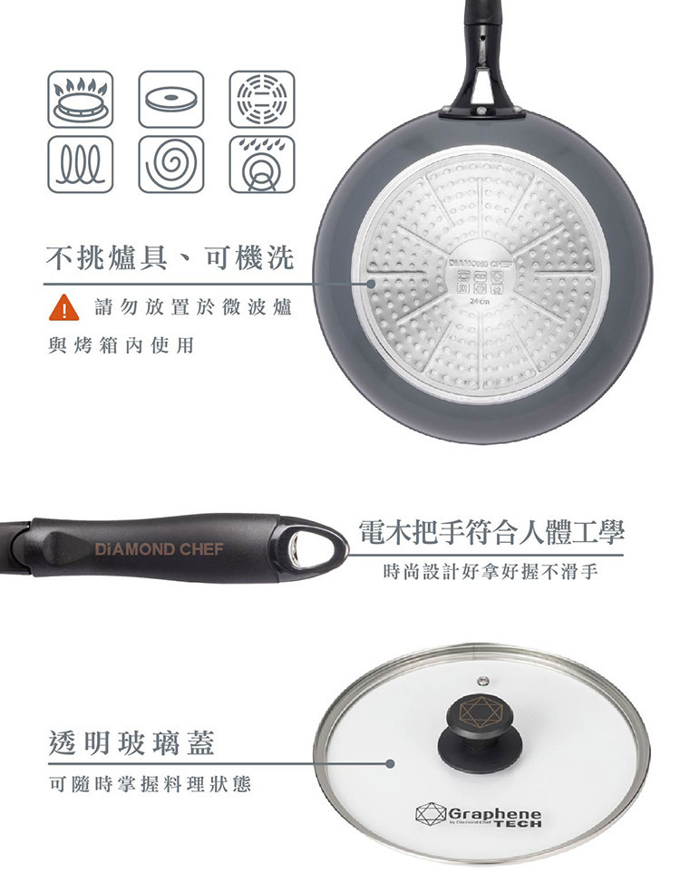 材質:鍋體-鋁合金、鍋內-石墨烯不沾塗層、鍋外-陶瓷塗層、鍋底-不鏽鋼覆底片、手柄-電木柄