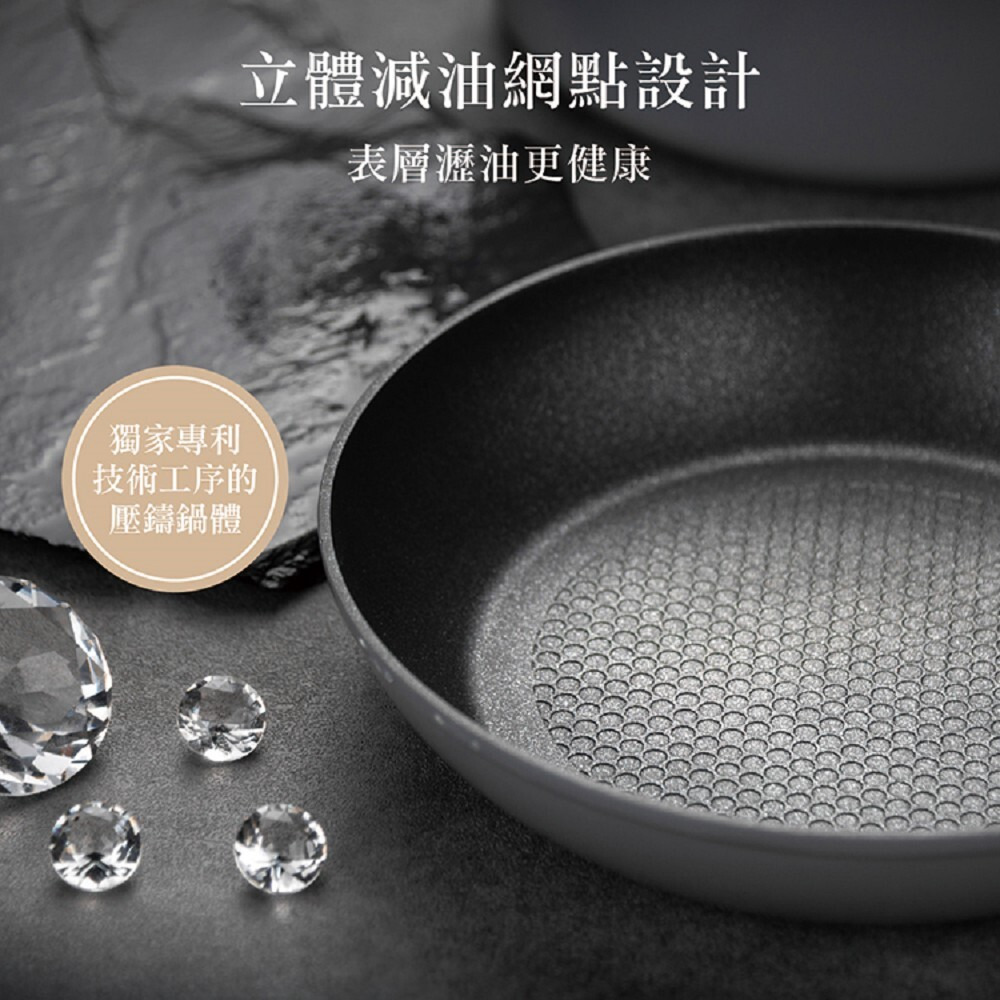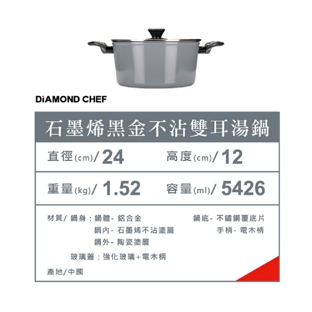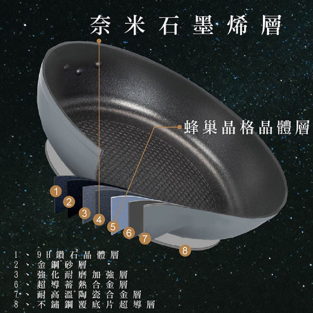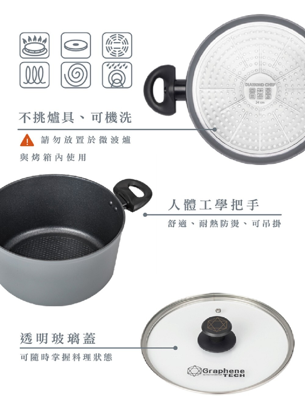 材質:鍋體-鋁合金、鍋內-石墨烯不沾塗層、鍋外-陶瓷塗層、鍋底-不鏽鋼覆底片、手柄-電木柄