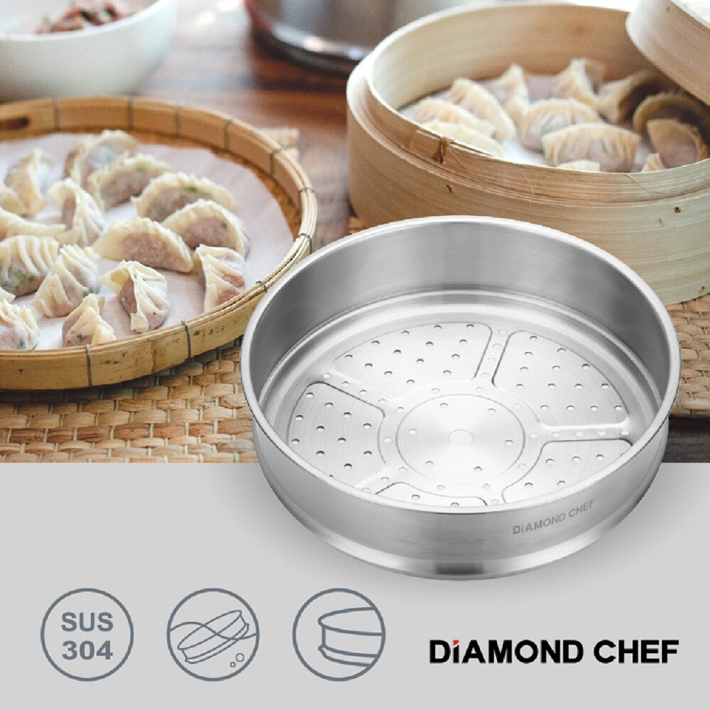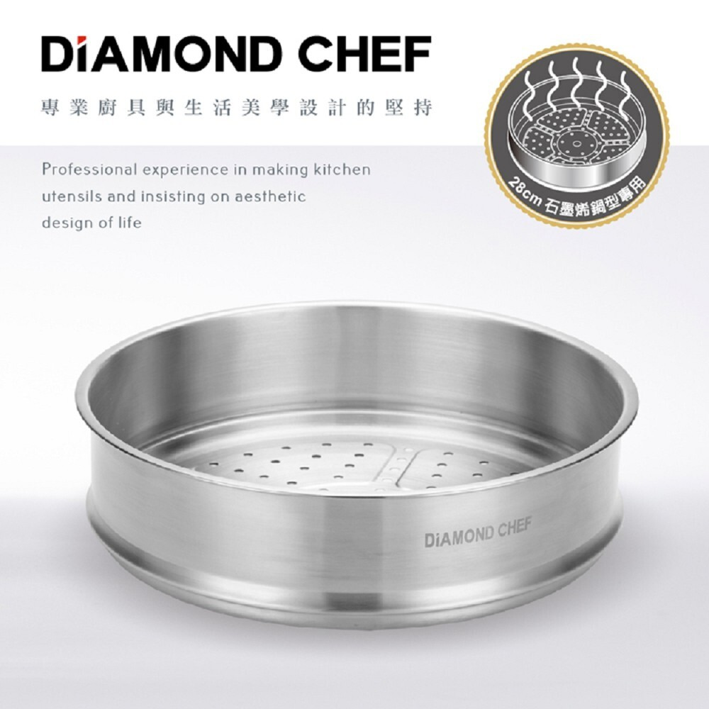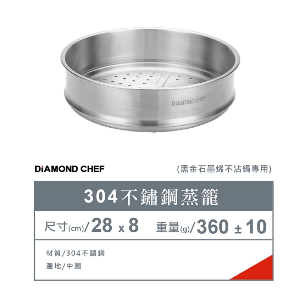 品名:DIAMOND CHEF專用不鏽鋼蒸籠(28公分) 材質:304不鏽鋼 尺寸:28 X 8 cm 顏色:銀色 淨重:360g ± 10g 產地:中國 注意事項: ● 請同一般不沾鍋清洗方式,建議使用海綿、精緻鍋具專用菜瓜布清洗,以延長鍋具使用壽命。 ● 上述尺寸為人工測量 ±5%誤差為正常範圍。